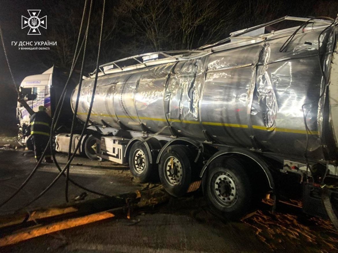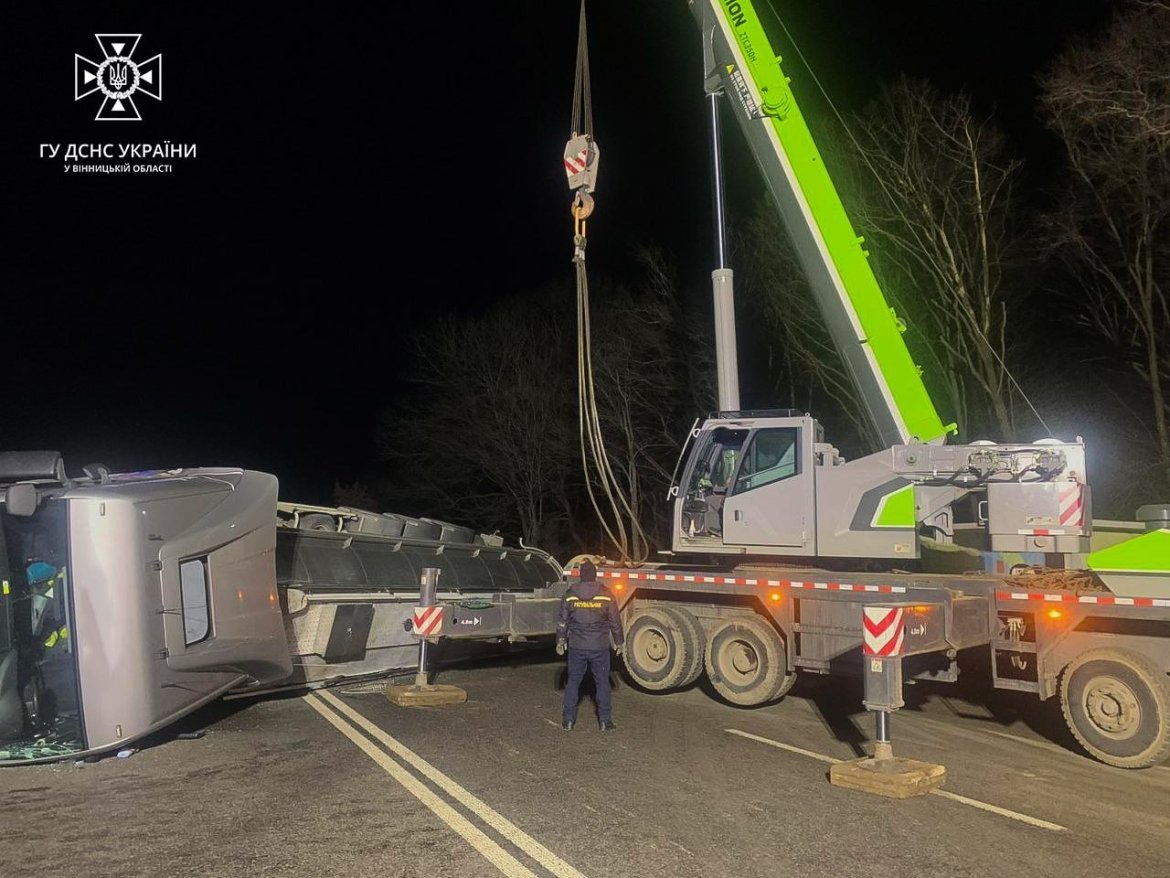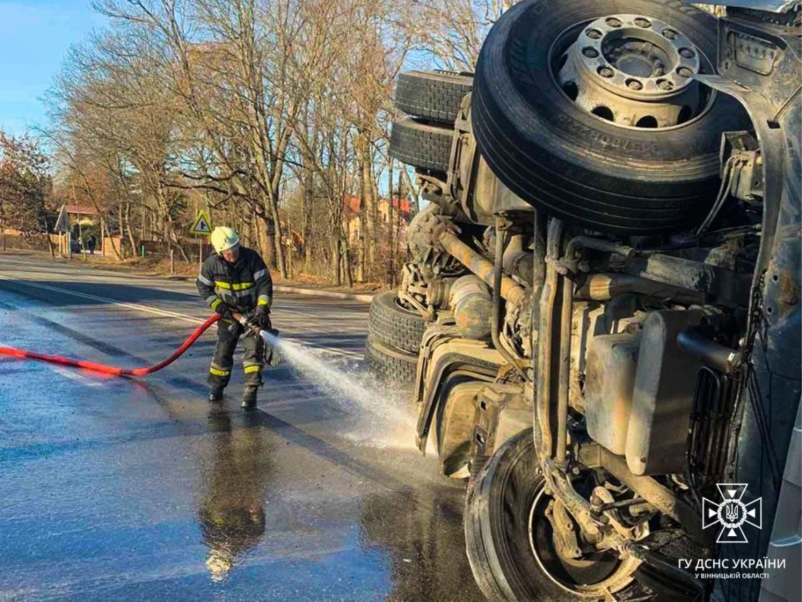 Рятувальники Вінниччини провели аварійно-рятувальні роботи при дорожньо-транспортній пригоді, яка сталася поблизу м.Гайсин.Бійці ДСНС за допомогою автокрану частини спеціальної пожежної техніки ГУ ДСНС України у Вінницькій області й спецтехніки інших підприємств надзвичайники прибрали вантажівку з цистерною з проїжджої частини дороги, - йдеться в інформації.