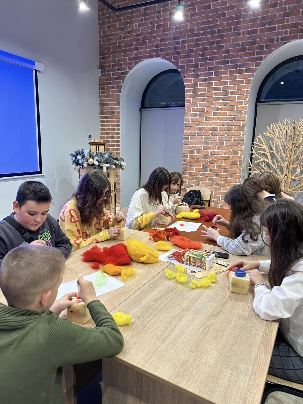 Для дітей також провели майстер-клас із сухого валяння від майстрині Олександри Вдовиченко, в ході якого юні вінничани створювали сердечка-магніти «I love Vinnytsia». Завершилась зустріч чаюванням з вінницькими смаколиками.