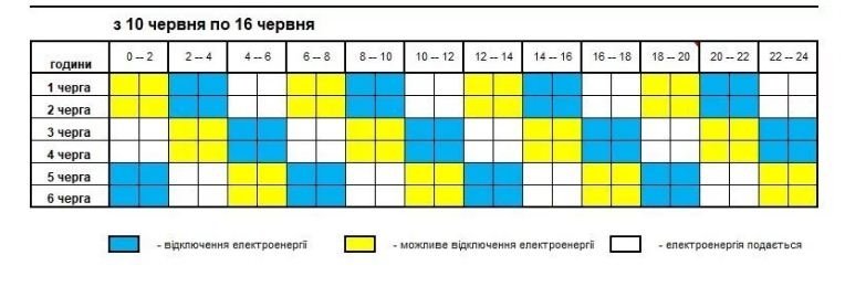 У графіку точний час знеструмення познаено блакитним. Якщо ж ситуація зміниться, то світло можуть вимикати ще й у години позначені жовтим. Тож тоді тривалість знеструмлення збільшиться ще на дві - чотири години залежно від черги.