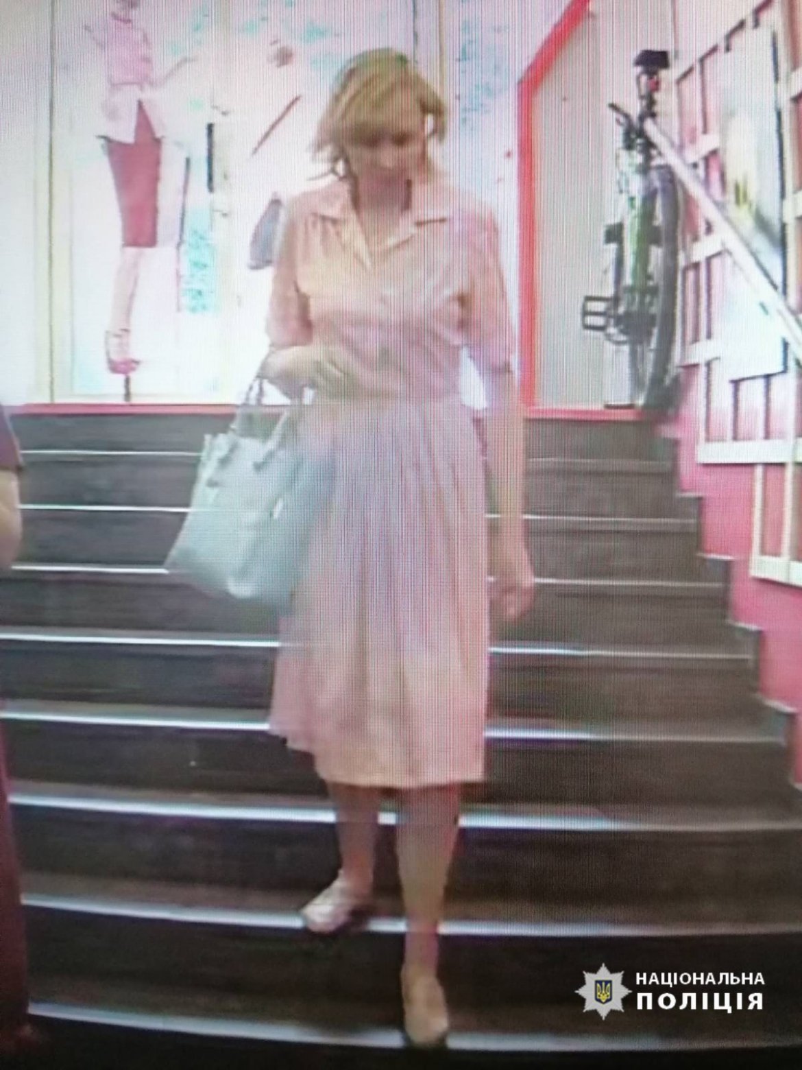 Поліція встановлює особу жінки. Прикмети розшукуваної: на вигляд 30 років, має світле волосся жовтуватого кольору, була одягнута у сукню рожевого кольору в білий горошок, мала при собі сумку світло- сірого кольору, - йдеться в інформації.