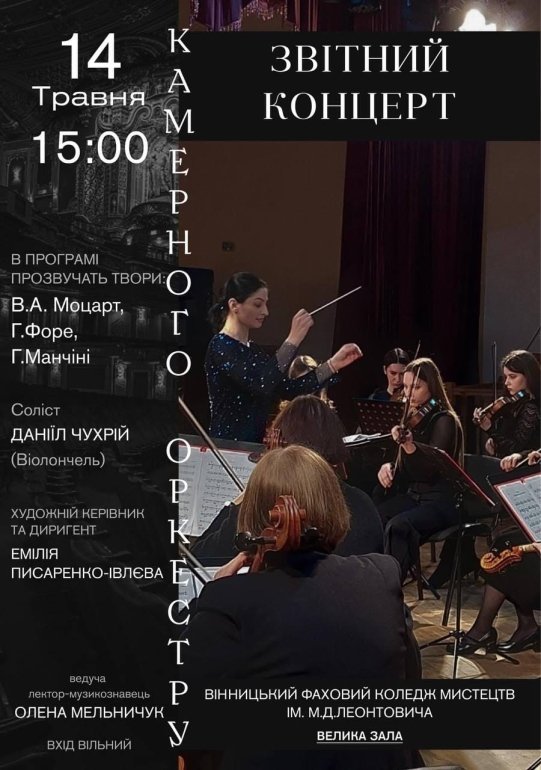На виступ камерного оркестру можна завітати 14 травня, у вівторок. Поціновувачі класики можуть послухати В. Моцарта, Г. Форе, Г. Мончіні.