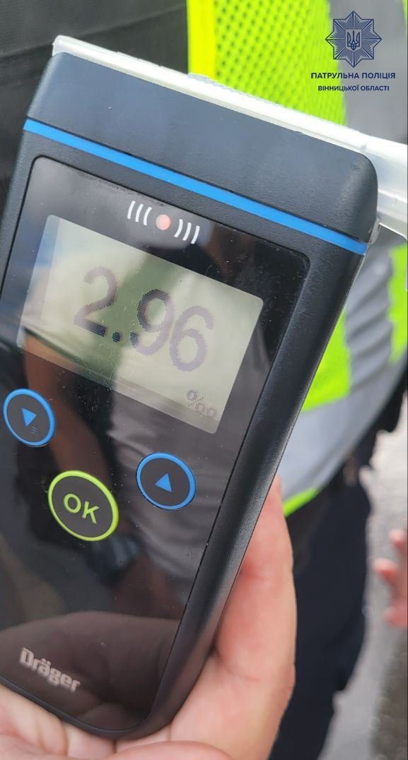 Спілкуючись із винуватцем автопригоди, інспектори помітили, що він добряче випив. Тож запропонували пройти перевірку на алкотестері. Результат - 2,96 проміле aлкоголю, що мaйже в 15 рaзів перевищує норму.