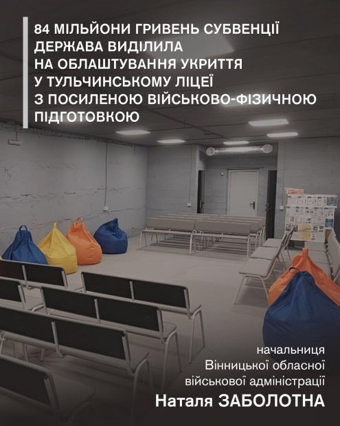 Держава виділила 84 мільйони гривень субвенції на облаштування укриття у Тульчинському ліцеї з посиленою військово-фізичною підготовкою. Відповідне рішення ухвалив Уряд у межах розподілу коштів для закладів освіти в регіонах.