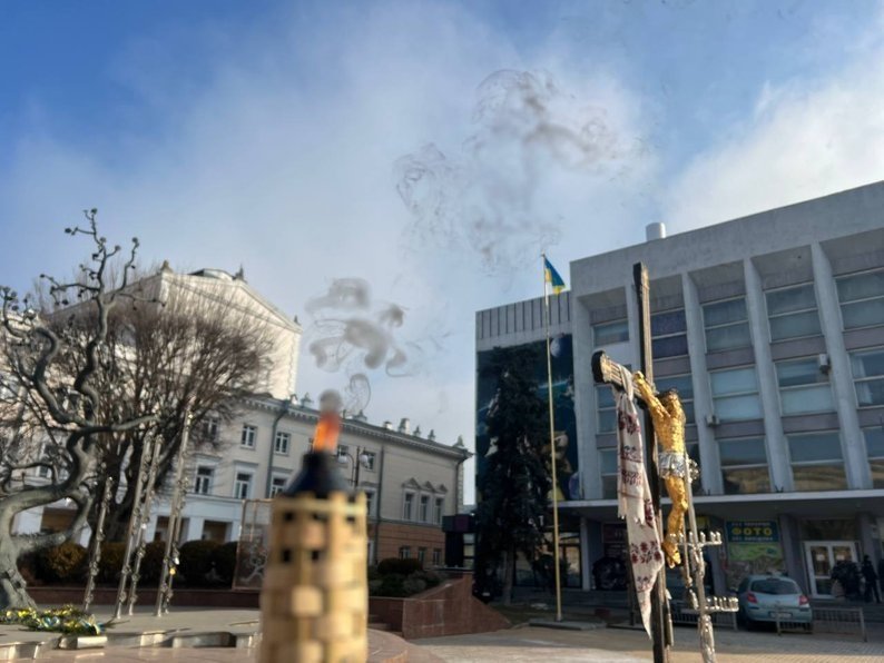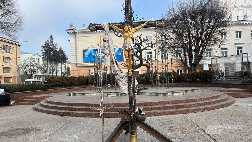 У Вінниці, на площі Небесної Сотні, 12 лютого презентували унікальну інсталяцію «Хрест Миру», як повідомили кориспонденти Суспільного. Скульптура Ісуса Христа, створена з 20 тисяч уламків артилерійських снарядів, символізує біль, боротьбу та надію на мир в Україні.