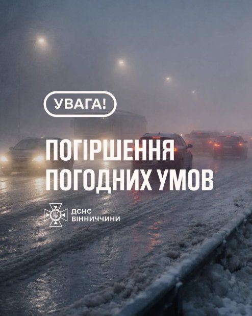 У Вінницькій області 7 лютого очікується ускладнення погодних умов. Прогнозують ожеледь товщиною 6–19 мм, на автошляхах — ожеледицю, а вночі та вранці — туман із видимістю 200–500 метрів. Оголошено 1 рівень небезпечності (жовтий).