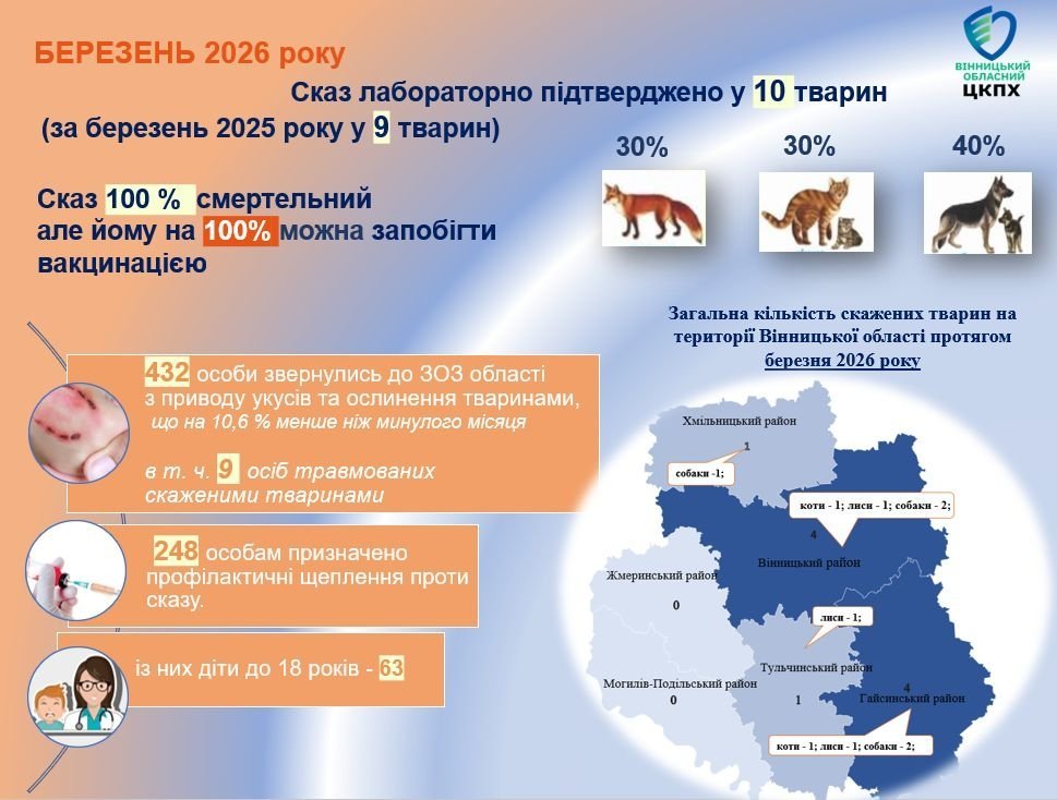 Загалом у січні–березні 2026 року через укуси чи ослинення тваринами до медиків звернулися 1167 людей, із яких 51 постраждав саме від скажених тварин. Найбільше звернень зафіксували у Вінницькому районі — 626 випадків. Далі йдуть Гайсинський (151), Жмеринський (119), Тульчинський (110), Хмільницький (106) та Могилів-Подільський (55).