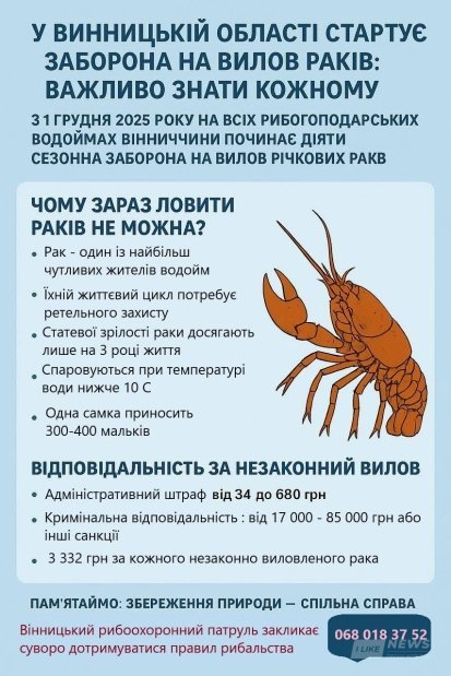 З 1 грудня 2025 року на всіх рибогосподарських водоймах Вінниччини починає діяти сезонна заборона на вилов річкових раків. Триватиме вона до 30 червня 2026 року включно.