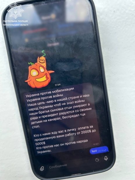 Учень тернопільської школи отримав повідомлення з антидержавними закликами та пропозиціями «заробити» під виглядом «мирних закликів». Автор повідомлення закликав виступати проти мобілізації, пропонував гроші за «виконану роботу» та намагався посіяти недовіру до влади.