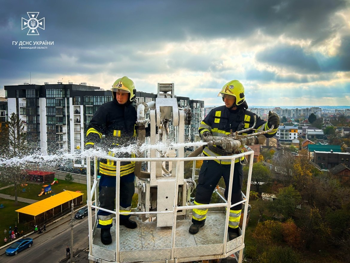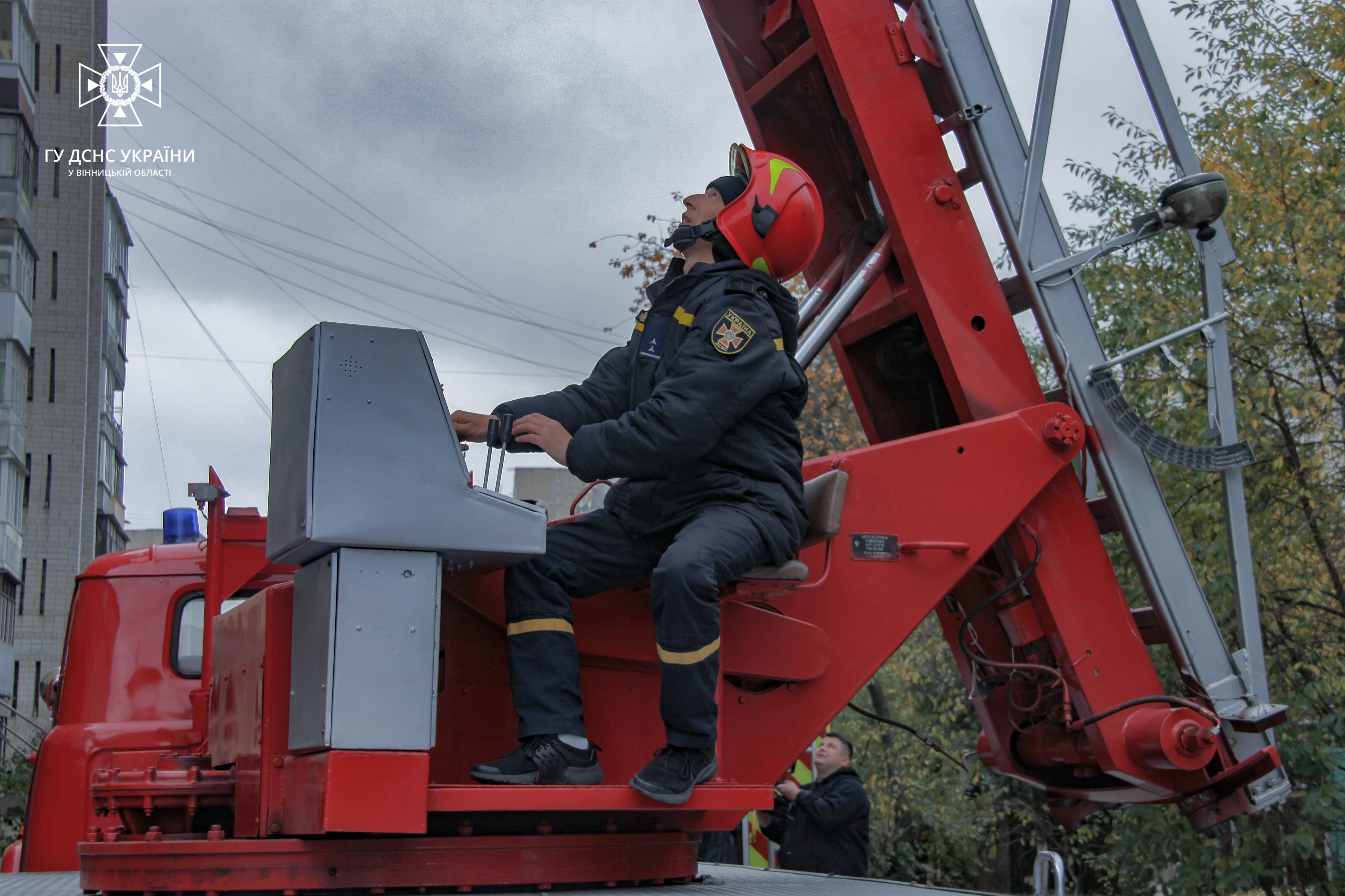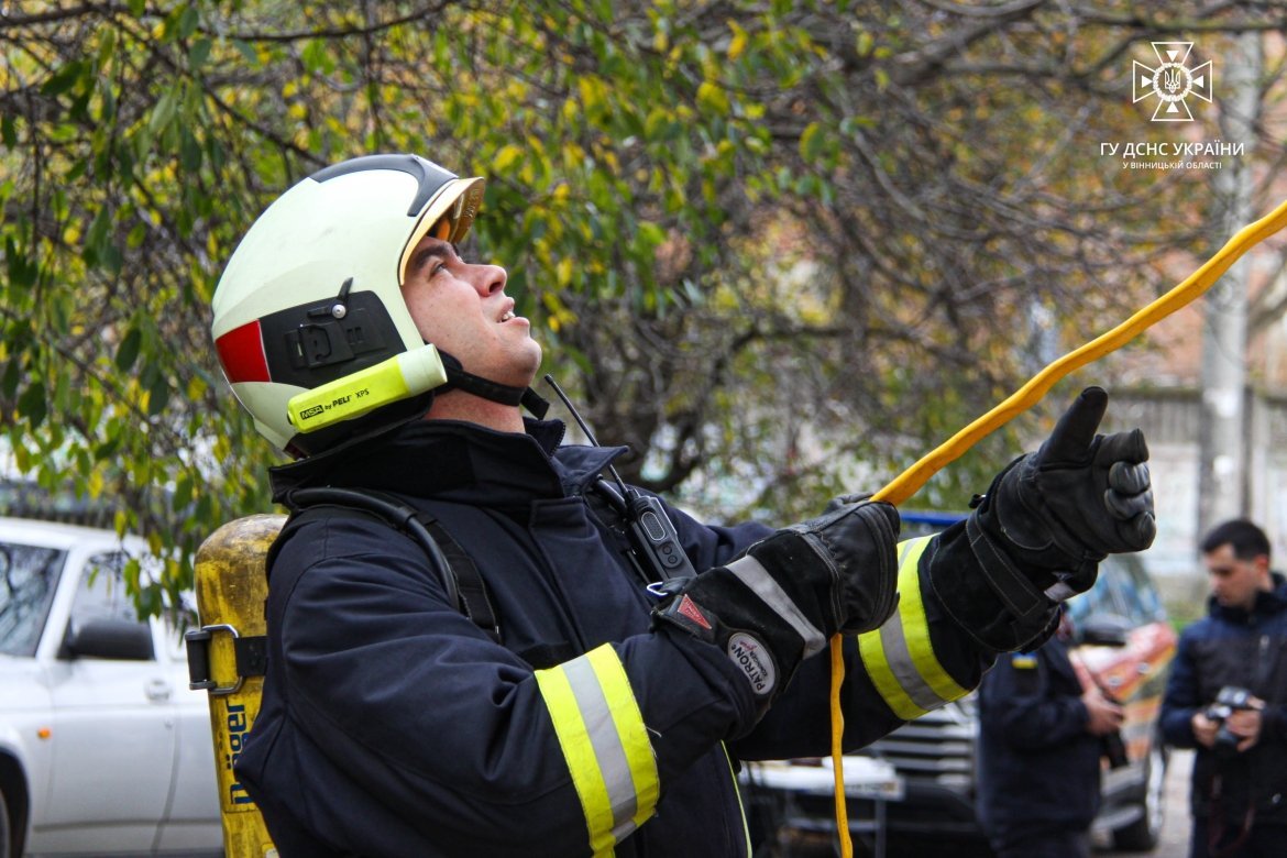 У Вінниці бійці Державної служби з надзвичайних ситуацій (ДСНС) провели навчання з ліквідації пожежі в багатоповерховому будинку. У відомстві повідомили, що до цих тренувань було залучено 40 рятувальників та 6 одиниць техніки. Пожежа виникла на 8 поверсі однієї з квартир у висотці у Вінниці. У зв'язку з сильним задимленням під'їзду, власник квартири залишився заблокований усередині. Рятувальники застосували апарати для захисту дихання та евакуювали людину через балкони та сходову клітину. За допомогою автодрабини та колінчастого підіймача вони приборкали полум'я.