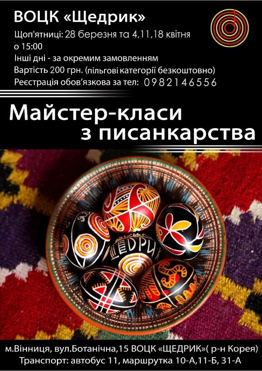 З 28 березня у Вінницькому обласному центрі культури «Щедрик» розпочинаються майстер-класи з писанкарства. Заняття будуть проводитися щоп’ятниці о 15:00. Майстер-класи відбудуться 28 березня, а також 4, 11 і 18 квітня.