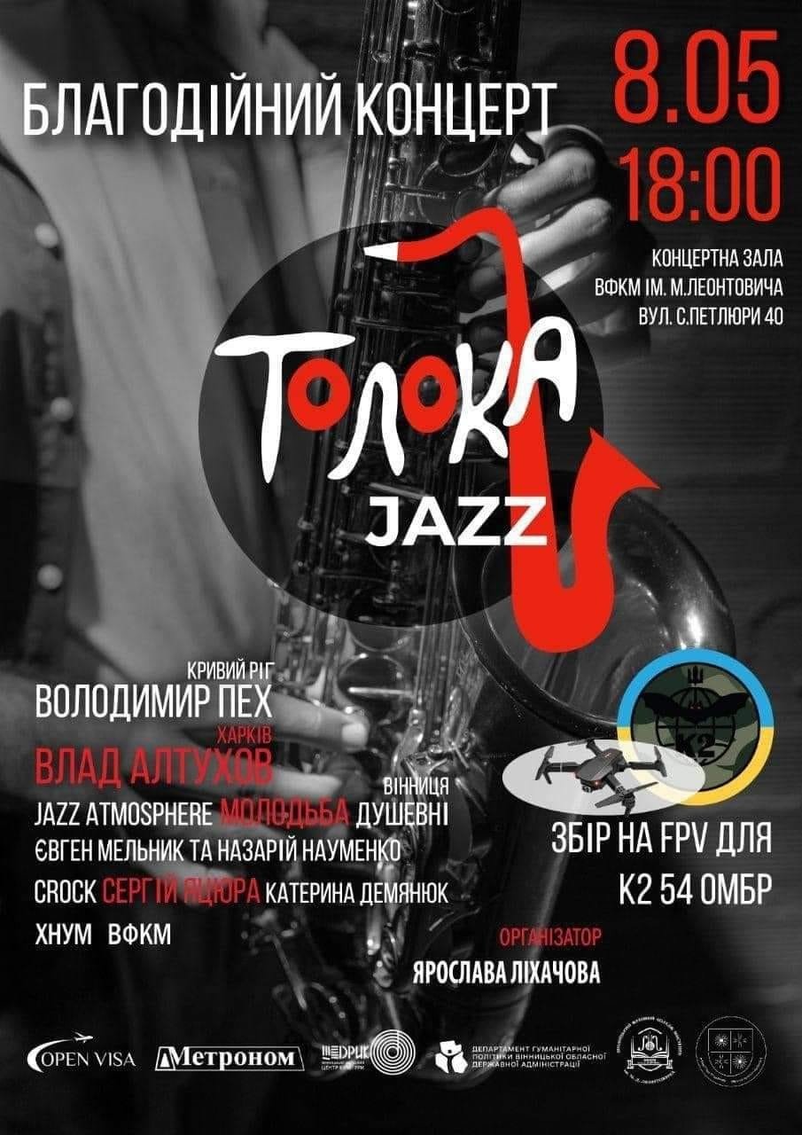 Сьогодні, 8 травня, у великій залі Вінницького фахового коледжу мистецтв імені Миколи Леонтовича відбудеться благодійний концерт. Толока Jazz. Виконавці виступатимуть безкоштовно, а глядачі донатимуть на квадрокоптер.