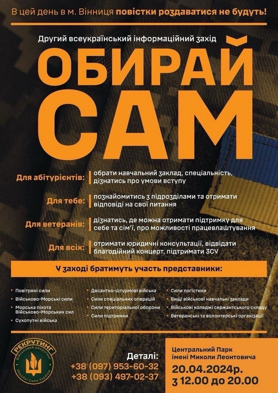 У Вінниці 20 квітня відбудеться інформаційний міні-фест "Обирай Сам" для військовозобов'язаних, організований ЗСУ, де повістки роздаватись не будуть. Про це повідомляє представник 120-ї бригади територіальної оборони ЗСУ, Роман Ковальський.