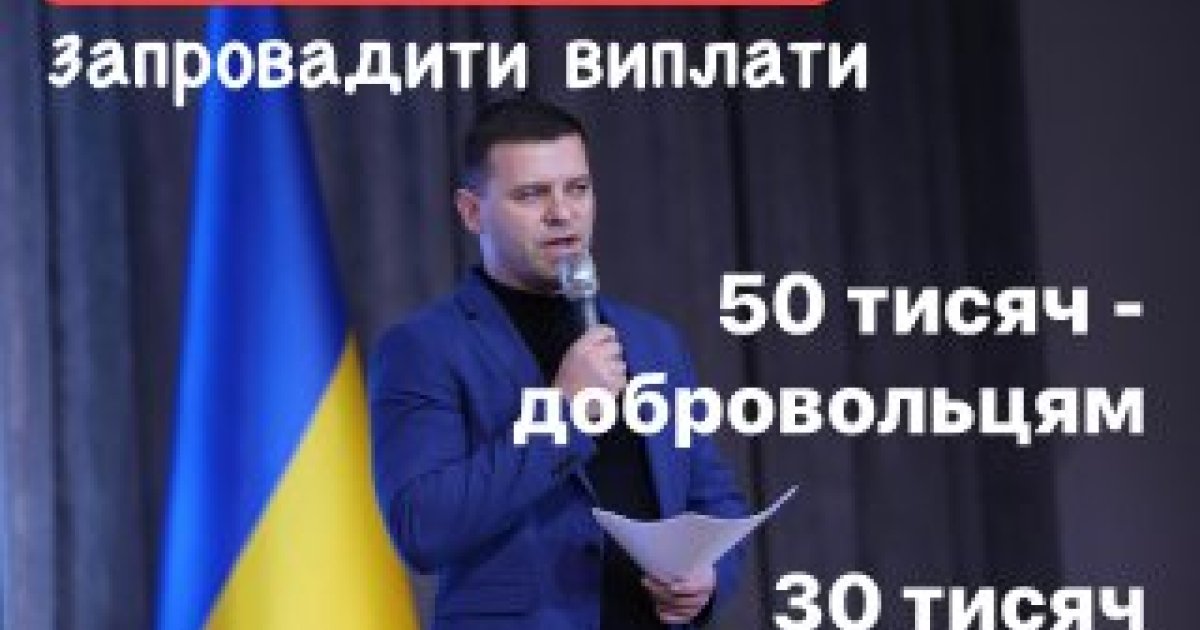 Він пропонує запровадити одноразові виплати 50 тисяч гривень тим, хто добровільно підписує контракт із Збройними Силами України та 30 тисяч гривень мобілізованим мешканцям Вінниці.