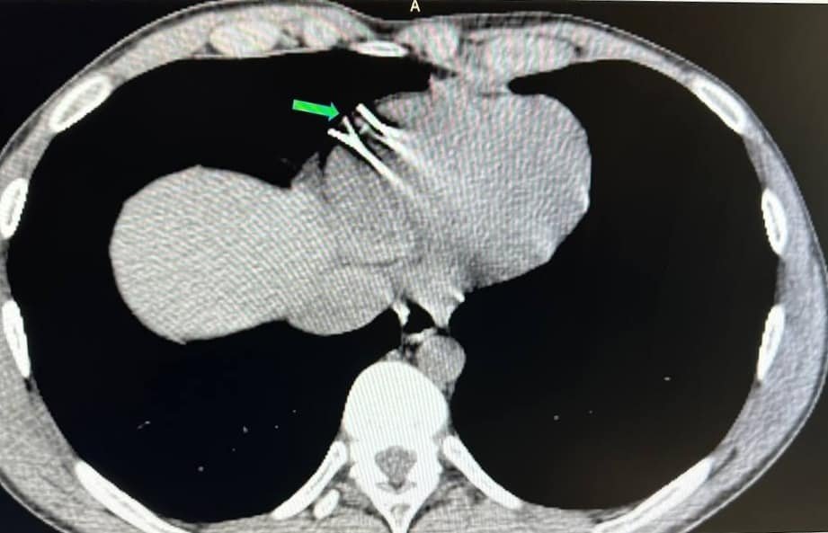 Вінницька обласна клінічна лікарня імені М. І. Пирогова повідомила, що 22-річний пацієнт зазнав проникаючої травми грудної клітини. Діагностичні процедури виявили два чужорідні тіла - металеві фрагменти у стінці правого шлуночка серця.