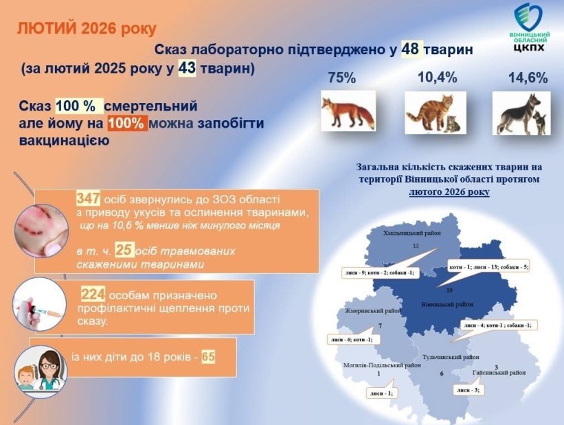 За перші два місяці року по антирабічну допомогу через укуси або ослинення тваринами звернулися 735 людей. Із них 42 особи постраждали від тварин, хворих на сказ. Найбільше звернень зафіксували у Вінницькому районі — 412.