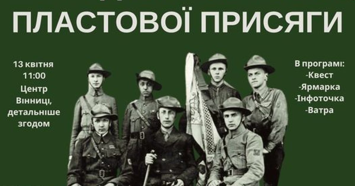 Вінницький пласт проведе урочистості з нагоди Дня Першої Пластової Присяги. Перша церемонія посвяти у пластуни відбулася на початку минулого сторіччя. Тепер щорічно у всьому світі прихильники руху відзначають цю знаменну дату.