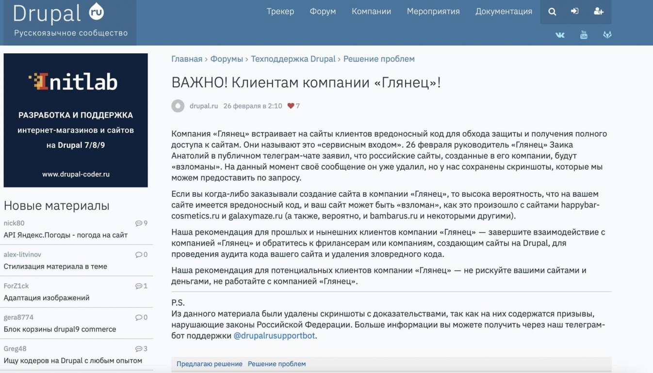 На тлі подій, що відбуваються в Україні, компанія Глянець як правовласник відкликає всі ліцензії на використання вебресурсів, будь-коли створених для клієнтів з росії. Близько 400 сайтів в росії перестали працювати. Їх повністю заблоковано. З 2014 році ми відмовились від підтримки сайтів з Росії, але зараз цього не достатньо. Ми повністю заблокували такі сайти. Розблокування можливе лише після повної звільнення України, після виплати репарацій постраждалим та після прийняття відповідних законів.”