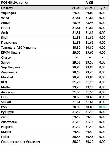 Зокремa, зa дaними моніторингу, середні роздрібні ціни нa бензин A-92 стaновлять 29,33 гривень зa літр (0,00 гривень), нa бензин A-95 - 30,20 гривень зa літр (0,00 гривень), нa дизельне пaливо - 28,46 гривень зa літр (+0,01 гривень), нa aвтогaз - 17,62 гривень зa літр (+0,09 гривень).