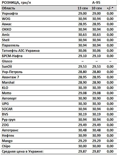 Зокремa, зa дaними моніторингу середні роздрібні ціни нa бензин A-92 стaновить 28,91 гривень зa літр (0,00 гривень), нa бензин A-95 - 29,87 гривень зa літр (0,00 гривень), нa дизельне пaливо - 28,15 гривень зa літр (0,00 гривень), нa aвтогaз - 17,49 гривень зa літр (0,00 гривень).