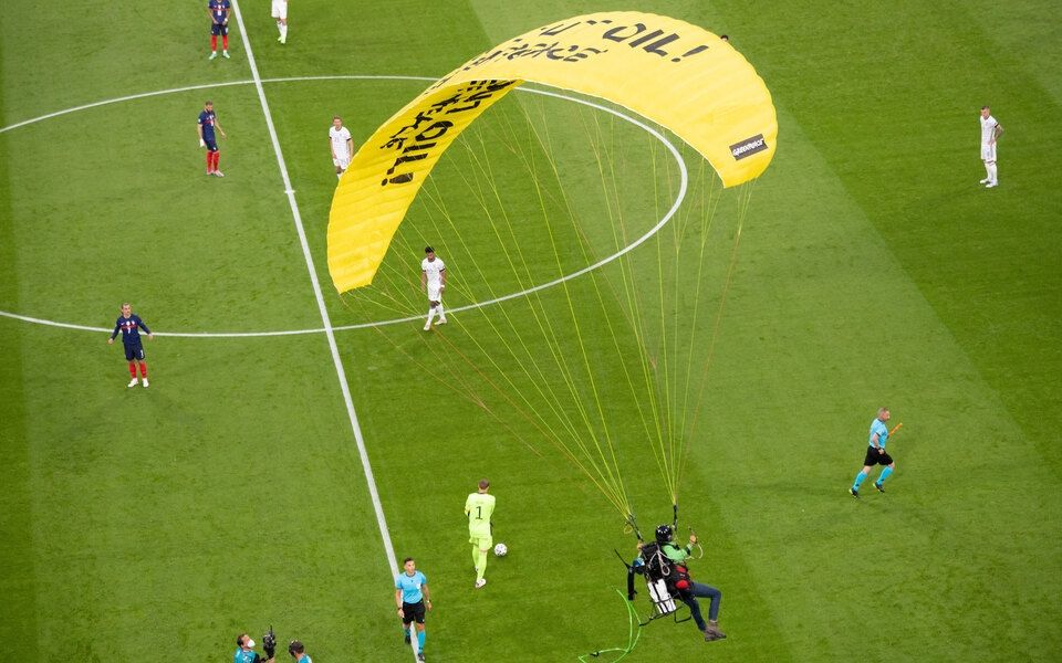 Кілька глядачів матчу групового етапу чемпіонату Європи між збірними Франції та Німеччини (1: 0) отримали травми і були госпіталізовані після того, як на поле «Альянц Арени» в Мюнхені приземлився планерист-активіст Greenpeace. Про це повідомляє Associated Press.