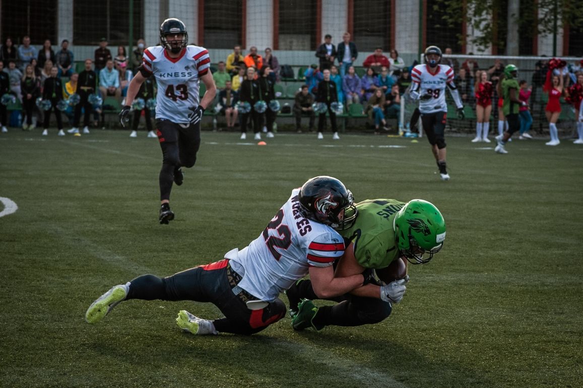 Спершу змінились місце проведення та час гри (гра мала бути на стадіоні «Юність» та розпочатись на дві год раніше). Через 20 хв після старту почалась сильна злива та гроза, тому гра була призупинена. Переломним моментом стала травма основного квотербека команди вже у 2-му розіграші і тренерам довелось швидко вносити зміни в комбінації нападу. Однак, все це не зламало бойовий дух нашої команди та бажання йти до кінця. В цей час захист був на висоті, він дійсно зіграв якнайкраще! Особливо варто відзначити Дзиганського Леоніда, Джамала Ньюмена та Проценко Ігоря, які виклались на повну. Пропустивши лише один тачдаун на початку утримувати всю гру натиск суперника, заблокувати екстрапоінт і філдгол – це теж виявилось дуже важливим і зіграло вирішальну роль.