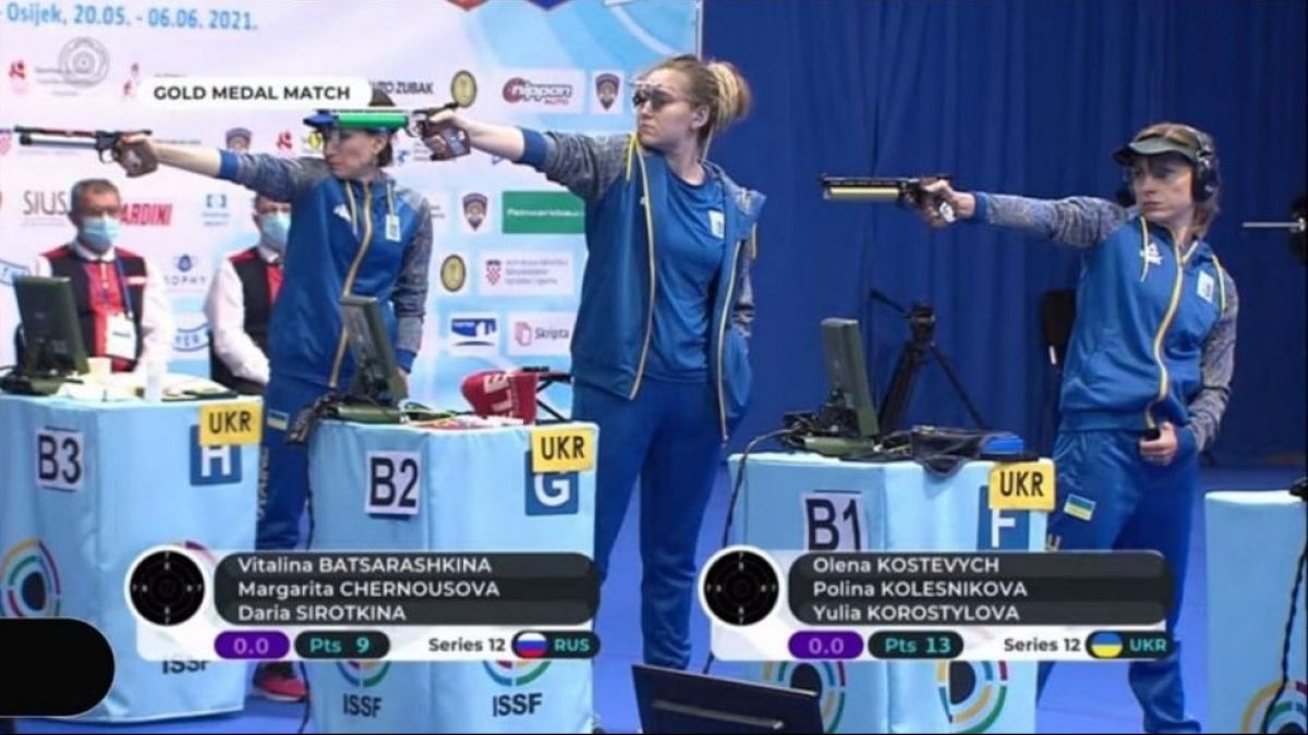 “Жіноча команда у складі Олени Костевич, Поліни Колеснікової та Юлії Коростильової здобуває звання чемпіонок Європи у стрільбі з пневматичного пістолета на дистанції 10 м.”, - йдеться у повідомлені