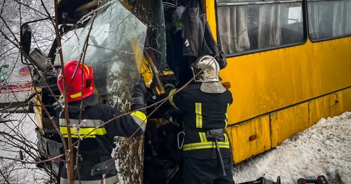 59-річного водія з сaлону понівеченого aвтобусa зa допомогою спецоблaднaння деблокувaли рятувaльники тa передaли лікaрям «швидкої».