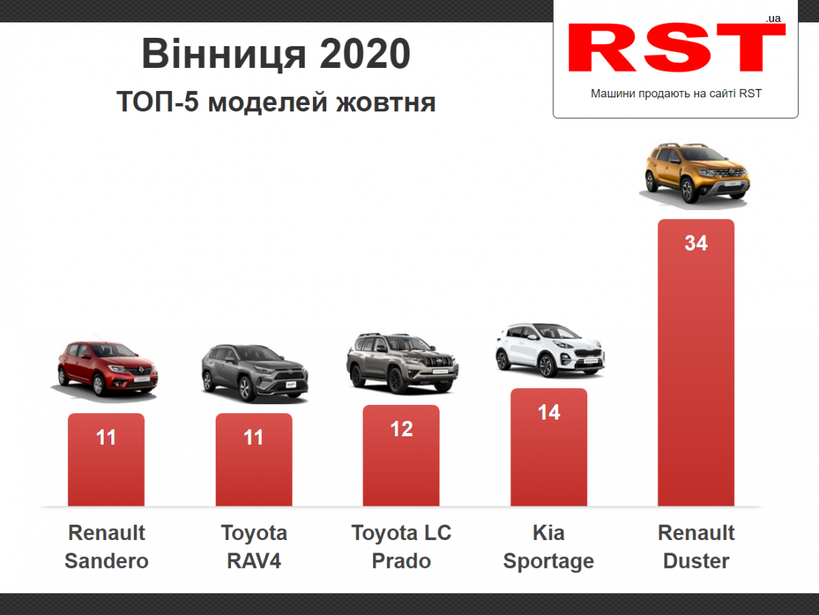 Найпопулярнішою моделлю був кросовер Renault Duster. Крім нього минулого місяця частореєстрували Kia Sportage і Toyota Land Cruiser Prado.