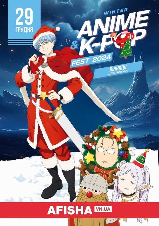 29 грудня о 16.00 у Вінницькому театрі ім. Садовського на «Winter Anime & K-pop Fest» вінничан вразять незабутні концерти зірок з Японії та України, яскраве косплей-дефіле, вокальні виступи і запальні танцювальні номери K-pop cover груп, креативні фотозони з персонажами найвідоміших аніме, ігор та улюбленими K-pop-айдолами у повний зріст, аніме і K-pop ярмарок, багато конкурсів з крутими призами, різноманітна розважальна програма, надзвичайна атмосфера і нон-стоп найяскравіших емоцій!