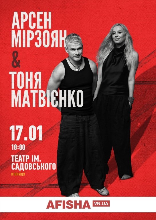 Квитки (від 380 грн) встигніть обрати на сайті https://afisha.vn.ua/events/arsen-mirzoyan-ta-tonya-matviyenko