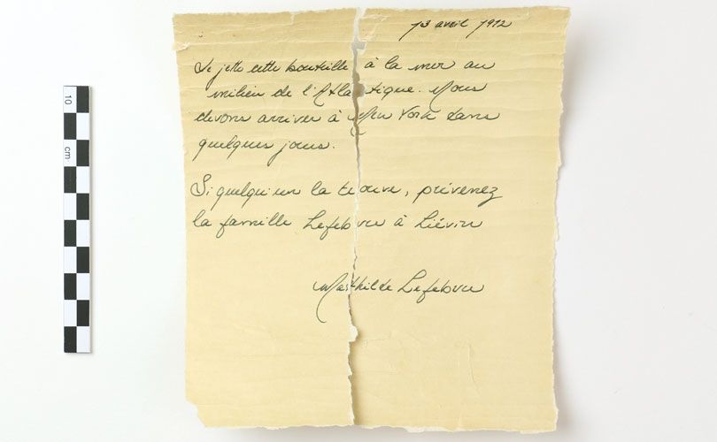 У пляшці опинився лист, який датується 13 квітня 1912 року. Він написаний від імені дівчинки Матильди Лефевр. За даними фахівців, дівчинка з таким ім'ям дійсно була пасажиркою третього класу затонулого судна. Вчені також зв'язалися з нині живими родичами Матильди.