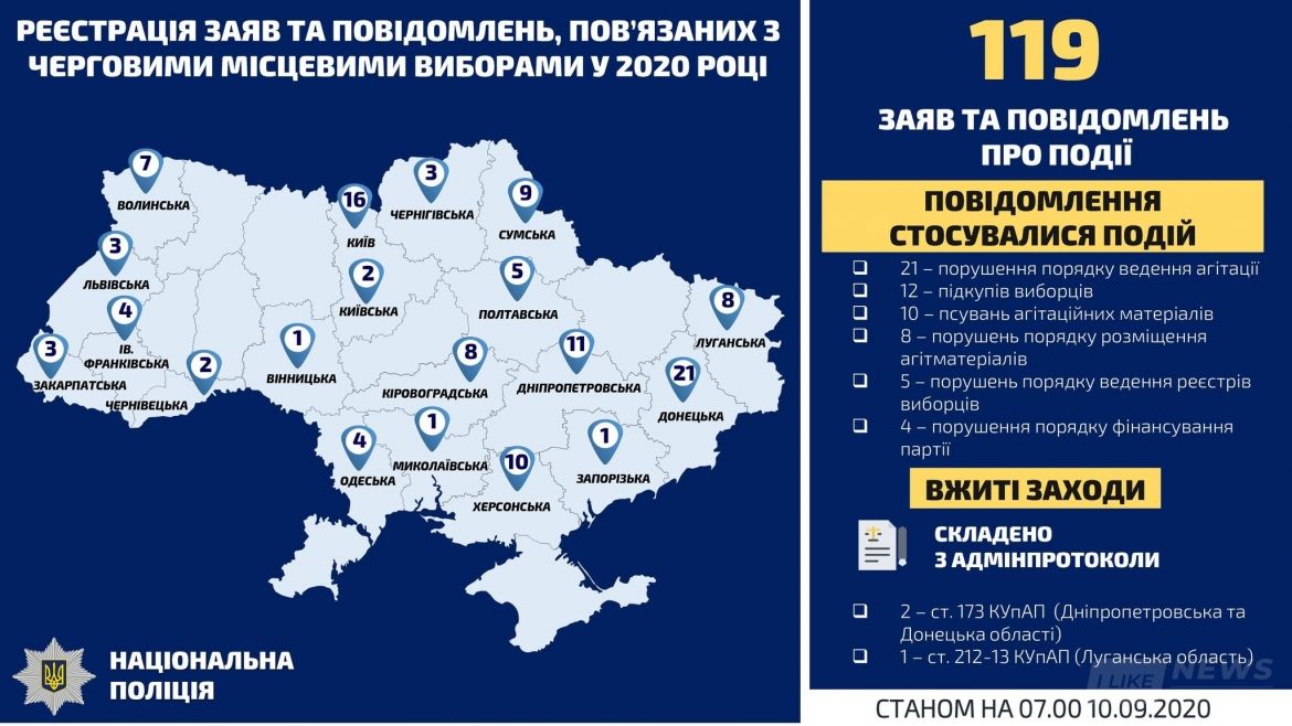 Відтак відкрито 4 кримінальні провадження за ст. 158 (Надання неправдивих відомостей до органу ведення Державного реєстру виборців або інше несанкціоноване втручання в роботу Державного реєстру виборців), 3 – за ст. 160 (Підкуп виборця, учасника референдуму, члена виборчої комісії або комісії з референдуму) Кримінального кодексу України.