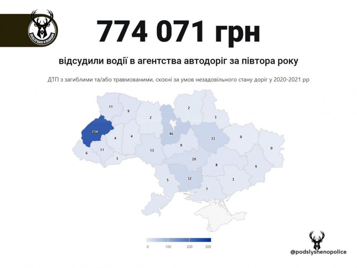 За даними патрульної поліції, через поганий стан доріг в 2020 - 2021 р 401 людини були травмовані і 70 загинуло. Більше третини загиблих і половина травмованих (27 і 207 відповідно) відносяться до Львівської області, яка традиційно тримає першість у ДТП такого типу.