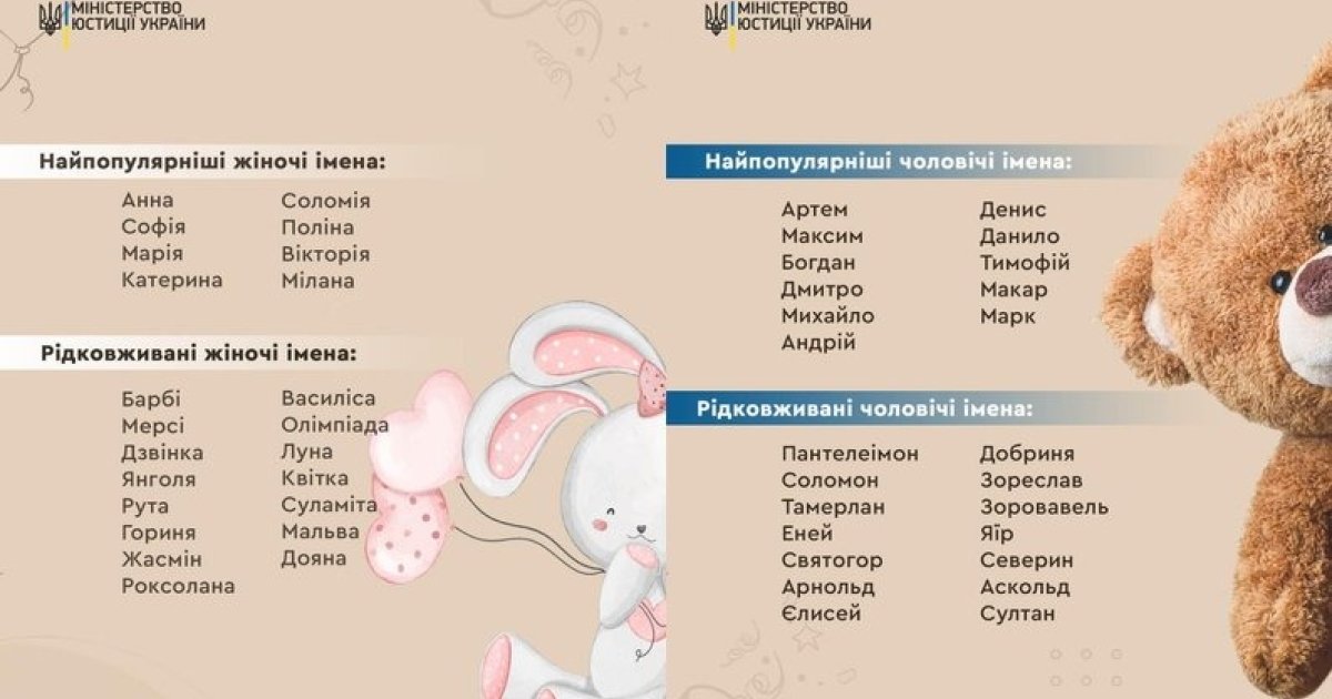 Міністерство юстиції України оприлюднило список найпопулярніших і найрідкісніших імен, якими називали дітей у 2024 році. Традиційно лідерами залишаються Софія та Артем, які вже кілька років поспіль очолюють рейтинги. Загалом цього року було зареєстровано 176 тисяч новонароджених.