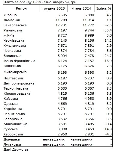 Рівненська область зараз займає третє місце з різким зростанням орендної плати на 35,4%, досягнувши 9744 гривні, тоді як у столиці, Києві, вартість оренди збільшилася на 3,0% до 8989 гривень, розміщуючи місто на четвертому місці за вартістю.