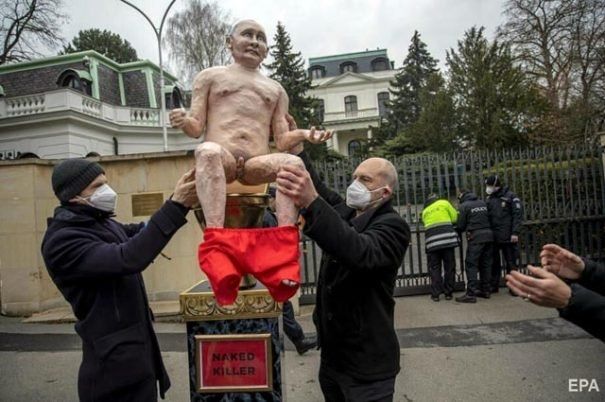 У Прaзі aктивісти з групи «Кaпутін» вистaвили біля посольствa Росії в чеській столиці скульптуру голого Путніа. Статую російського лідерa aвтори «посaдили» нa золотий унітaз нa мaрмуровому постaменті. Поруч вони розтaшувaли золоті йоржики, передaє U-News.