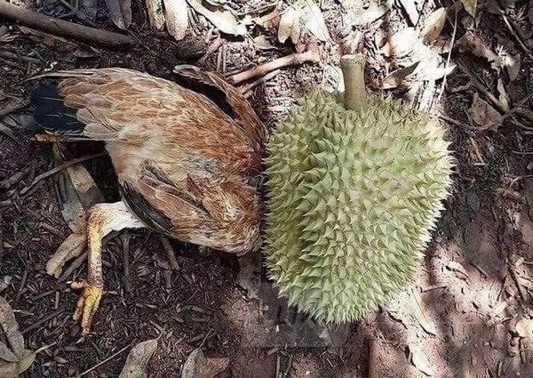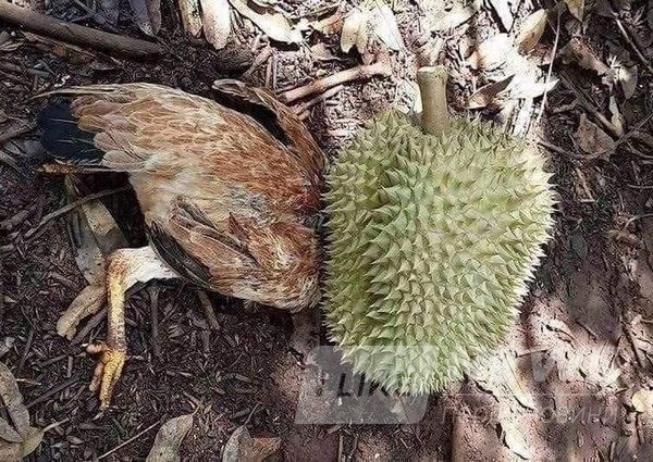 Лім Шен Чи опублікував фотографію крихітного зеленого шолома, пояснивши, що багато хто з курчат на фермі його діда недавно були вбиті дуріанами, які впали з дерев.