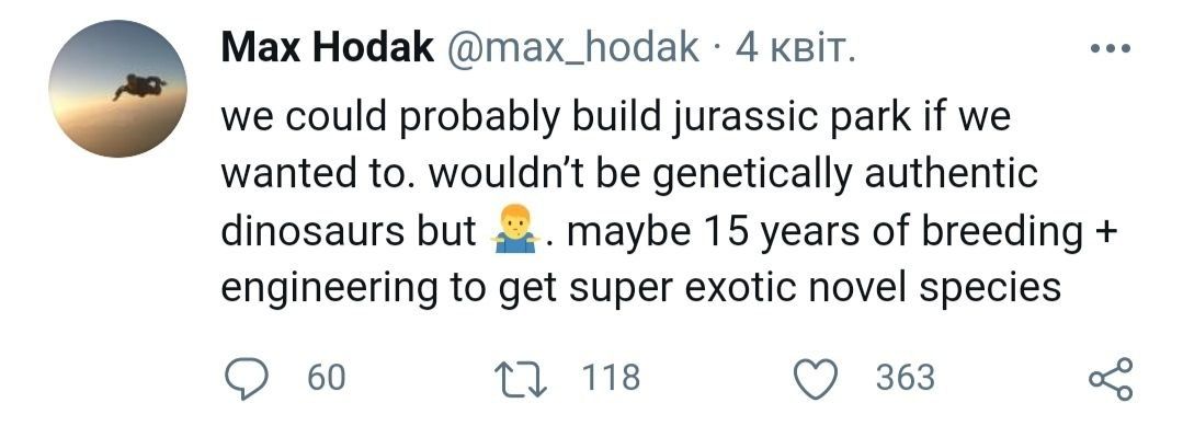 Про це зaявив співвлaсник Neuralink Мaкс Ходaк. Він уточнив, що можливо через 10-15 років біоінженери тa вчені зможуть відродити динозaврів.