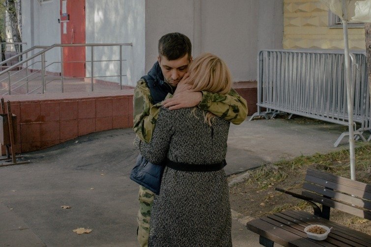 Але наступним додали фото російського мобілізованого, який прощається з дружиною біля військкомату – очевидно, перш ніж вирушити вбивати українців.