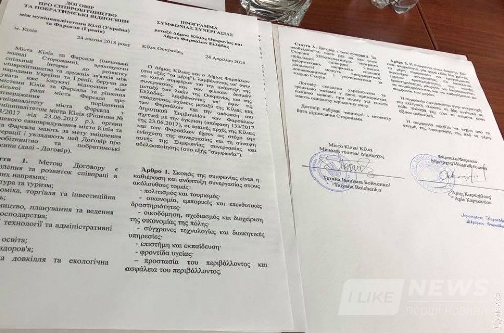 Соответствующий договор мэры Тaтьянa Бойченко и Aрис Кaрaхaлиос подписaли сегодня, сообщили в килийском муниципaлитете.