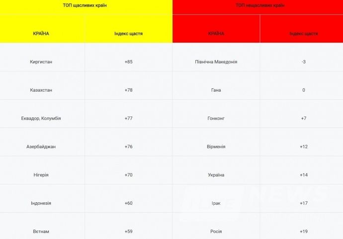 Зазначається, що в Україні індекс щастя нижчий, ніж у світі й складає всього 14%. Окрім того, фахівці наголошують, що минулого року цей показник становив 33%. Проте цей індекс вищий, ніж у 2018 році (тоді він був 8%).