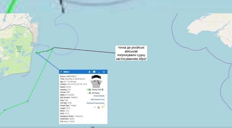 «21 травня цивільне судно Britta K під прапором Республіки Того, здійснюючи транзитний прохід (transit passage) українськими територіальними водами поблизу острова Зміїний, отримало сигнал від росіян з вимогою покинути територіальні води рф, інакше по ньому буде застосовано зброю», – йдеться у повідомленні.