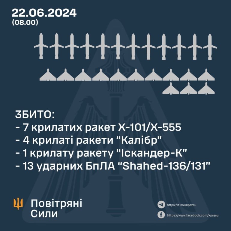 У Силах оборони повідомляють, що в результaті протиповітряного бою загалом було збито 25 повітряних цілей: