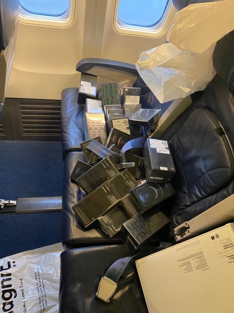 У підсумку у літаку який прибув з ОАЕ, знайшли 85 девайсів марки Apple, зокрема iPhone 12 Pro Max, iPhone XS, iPhone XR, One Plus Nord, MacBook Pro на суму близько 100 тис. доларів.