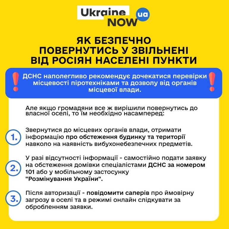 ДСНС наполегливо рекомендує дочекатися перевірки місцевості піротехніками та дозволу від органів місцевої влади. Але якщо громадяни все ж вирішили повернутись до власної оселі, то їм необхідно насамперед: