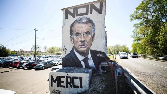У французькому Авіньйоні один з місцевих митців намалював мурал, на якому зобразив президента Емманюеля Макрона як диктатора Адольфа Гітлера
