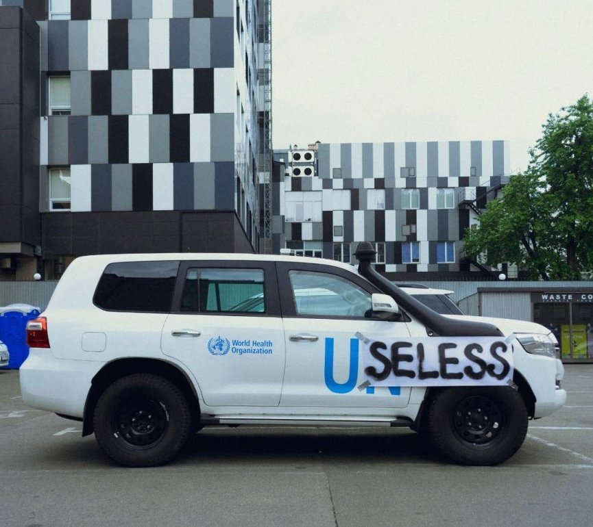 "Вчора в Україні росія спричинила найбільшу техногенну катастрофу за останні десятиліття. Тисячі людей залишилися без даху над головою, усі потребували допомоги. Зараз, наступного дня, на одній із київських автостоянок досі стоять "кілька" позашляховиків ООН та ВООЗ. "Кілька" білих чистих позашляховиків… Жодного вандалізму, лише висловлення позиції", – підкреслив автор.