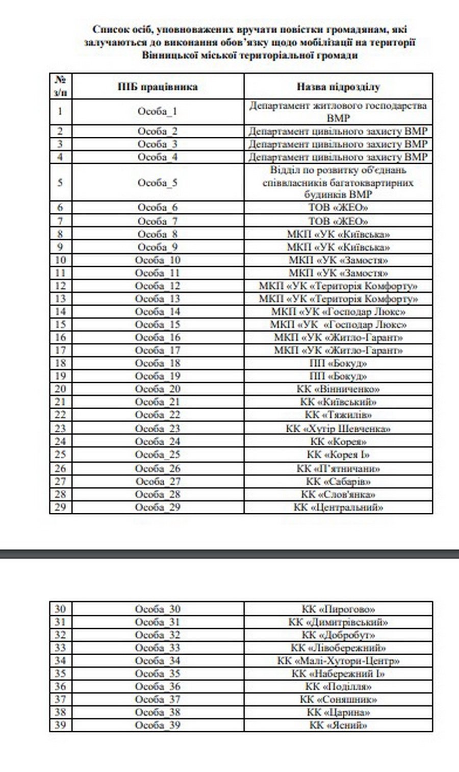 Рішенням виконкому міськради було затверджено список з 39 осіб із числа працівників окремих департаментів, ЖЕО та обслуговуючих комунальних компаній, які уповноважені вручати повістки за місцем проживання.