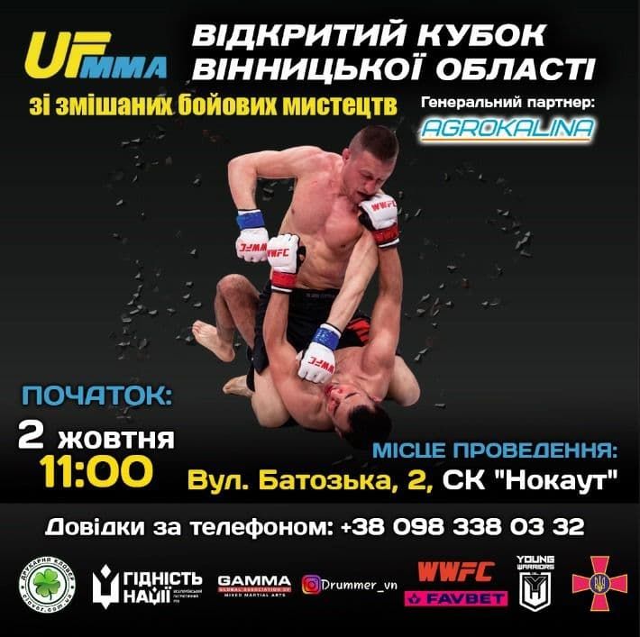 Другого жовтня у Вінниці відбудеться відкритий Кубок області зі змішаних бойових мистецтв за версією UFMMA. Змагання проходитимуть із дотриманням всіх карантинних вимог у спорткомплексі «Нокаут» (вул. Батозька, 2). Поєдинки почнуться о 11.00. Вхід глядачів – вільний.