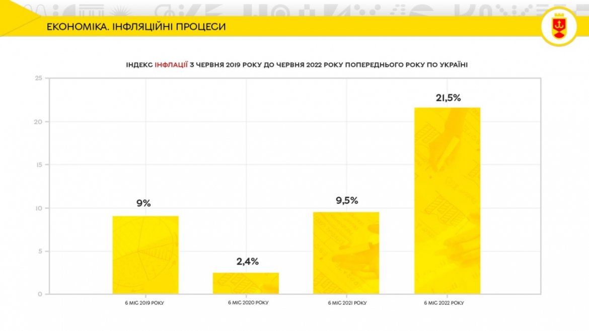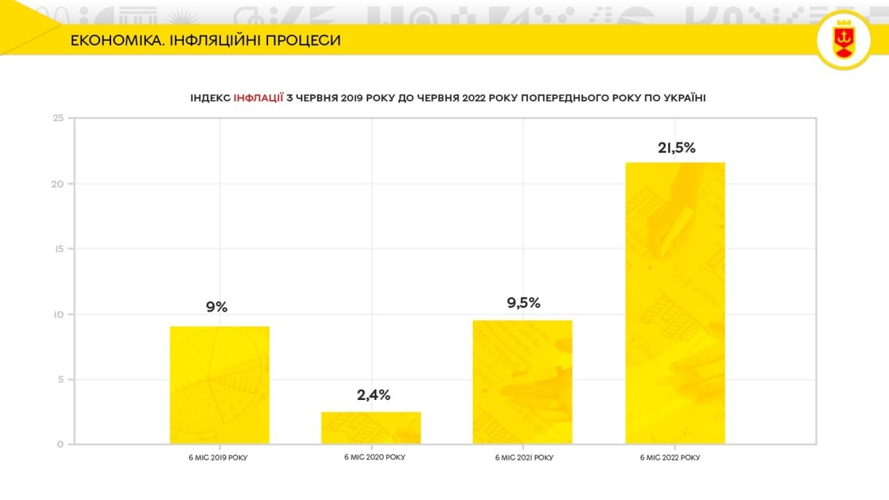 Вперше за останні роки інфляція становить двозначні показники. Так, індекс споживчих цін у червні 2022 року склав 21,5% або більш ніж в два рази вище за показник аналогічного періоду 2021 року. Наявні прогнози НБУ передбачають зростання інфляції до 30% до кінця року.